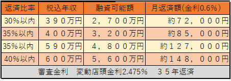 年収400万円前後、600万円前後で審査における借入可能な年間の返済金額が大きく変わってしまいます。