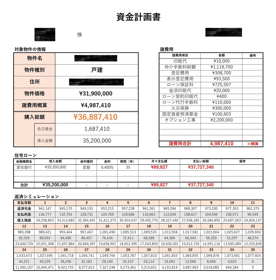 これは以前勤めていた不動産会社で実際にお客様にお渡しした資金計画書です。まずは、建売住宅の基本的な部分である、土地代や建物代にプラスして諸費用が加わります。具体的には、印紙代から始まり、仲介手数料、登記費用、ローン保証料、火災保険、固定資産税、オプション工事と様々な項目がある事が分かりますね。